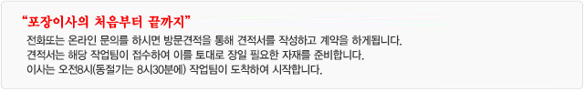 | ÀÌ»ç´çÀÏ ¼÷·ÃµÈ Æ÷Àå Àü¹®¿ä¿øµéÀÌ ¾à¼Ó½Ã°£ Á¤½Ã¿¡ µµÂøÇÏ¿© Á¶½É½º·´°Ô Æ÷ÀåÀ» ÇÕ´Ï´Ù.